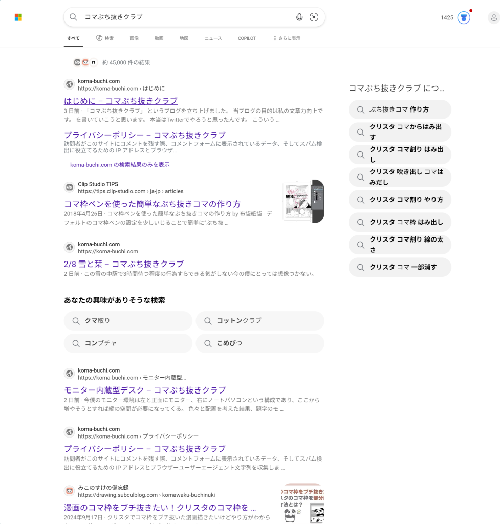 2026年2月12日の今日、ついに検索エンジン君たちがこのサイトを素知らぬ顔をして店先に並べ始めた。つい昨日まではEdgeやchrome等メジャーな検索エンジンでは完全一致で ”コマぶち抜きクラブ” と検索しても一切出ない体たらくだったのに。発信したという満足感を得つつも、心の底ではだれも見つけられまいと母親の胎内のような圧倒的な安心感を一方的に享受していた卑怯な僕についにメスが入った。これが社会に出るということか。彼らは背後から音もなく、まるでできるメイドさんのような仕事ぶりをやってのけた。ア、アリガトウゴザイマス…。